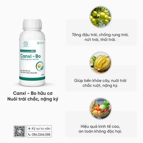 Canxi và bo là hai nguyên tố quan trọng đối với cây trồng, nhất là trong quá trình ra hoa kết trái. Phân bón siêu canxi bo giúp cây đẩy nhanh quá trình chuyển hóa chất dinh dưỡng, tăng đậu trái, kích thích trái lớn nhanh, gia tăng hàm lượng đường và vitamin có trong trái, nuôi trái chắc nặng ký, hạn chế tối đa hiện tượng rụng trái non, nứt, thối trái.